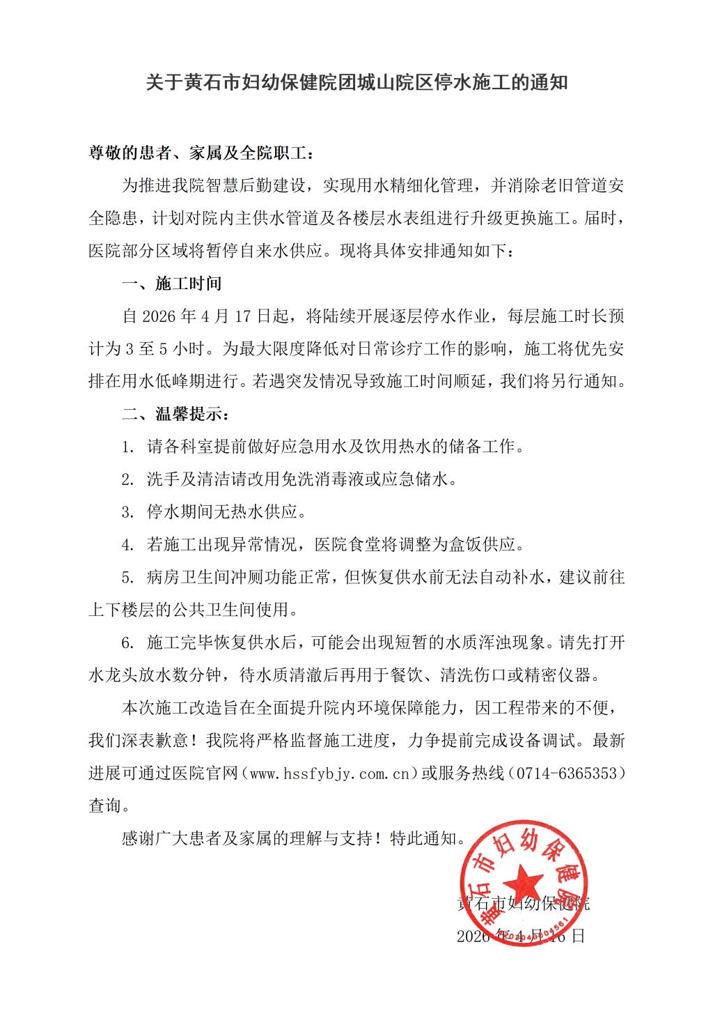 关于黄石市妇幼保健院团城山院区停水施工的通知