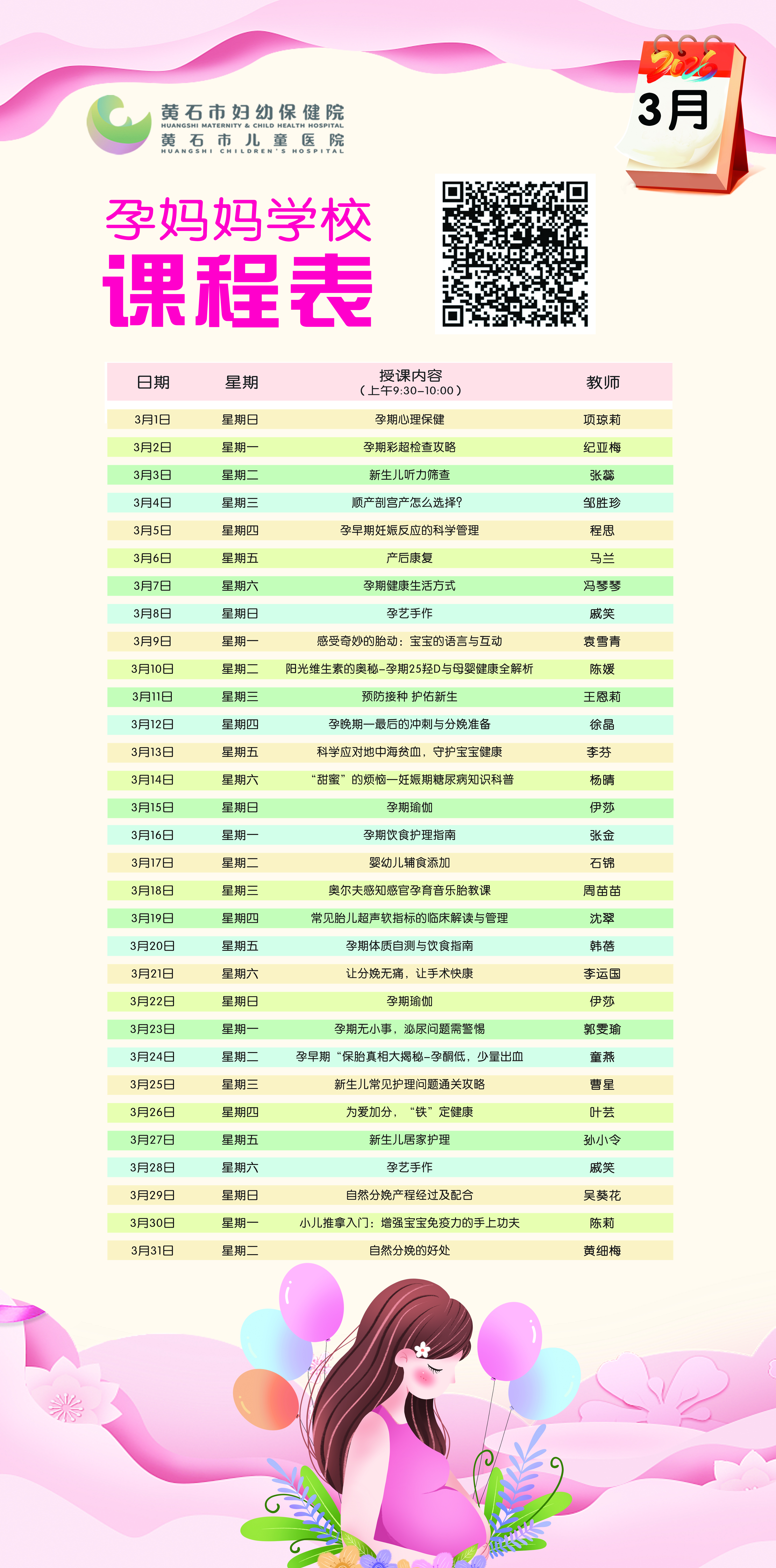 2026年黄石市妇幼保健院3月份孕妇学校课表